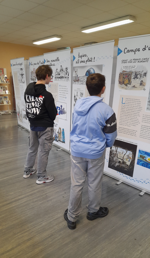 Les lycéens, avec leurs professeurs ou en autonomie, peuvent découvrir cette exposition composée de treize kakémonos, qui retrace le parcours complexe des migrants à travers des dessins de presse du monde entier.